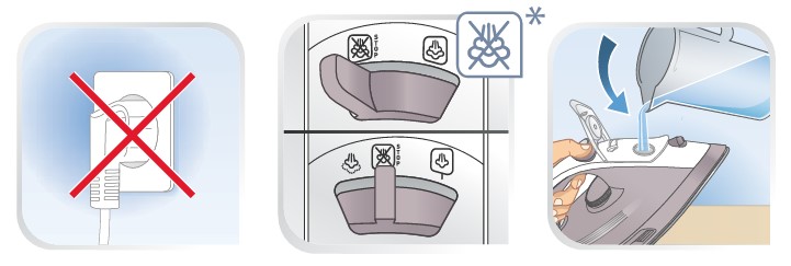 • Always unplug your iron before leaving it, cleaning it or filling it with water (unless it is a model that has a removable water tank). Regularly check the water level to ensure that there is always enough.