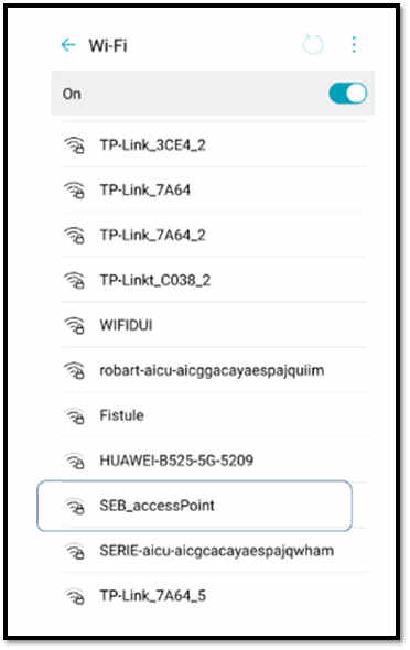 4) Allez dans les paramètres du téléphone et confirmez que vous voyez le réseau Wi-Fi appelé « SEB_accessPoint » (capture d'écran ci-dessous).